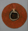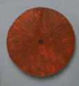 Label TextResembling a target, this circle filled with texture is actually a hat once worn by a Zulu woman in South Africa. This example, normally tilted at an angle by the wearer, uses a simple circle in the middle as a signature element. Called isicholo, the hat is created from a basketry base to which grass, false and real hair are added. Fat is mixed with powdered deep red ochre and applied to coat the hair, leaving a porous textured surface. After taxi drivers complained that the ochre dyes left stains on their cars, a new style was born: multicolored scarves are now added to update the hats with current fashion and protect cars from red smearing.