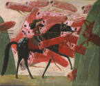 Label TextGaylen Hansen employed a host of animals and insects in his paintings along with his invented frontiersman alter ego, the Kernal. Often situated in landscapes reminiscent of the Palouse region of Washington, where Hansen has lived and worked for most of his life, his fantastical scenes evoke both a specific sense of place and the wonder of impossibility.