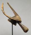 Label TextThe head of a Cape buffalo has been interpreted into a series of geometric shapes. Adapting the image of a burly slow-moving animal into a masquerade, carvers capture the swirling strength of its horns, completing the costume with a suit of tufted raffia. Energetic as a charging buffalo, the masquerader is called upon to witness appeals for vigorous crop fertility and childbirth.