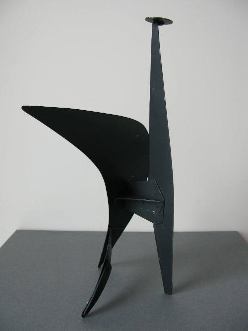 Label TextSome Calder sculptures were meant to only exist at a diminutive size, while other small works were considered studies for large-scale works. This stabile was part of a series of all-black works from the early 1940s, some of which were monumentalized for his 1943 solo exhibition at the Museum of Modern Art. This composition was not scaled up until 1966 for a seven-foot-tall work titled "The Bush and the Tree".
