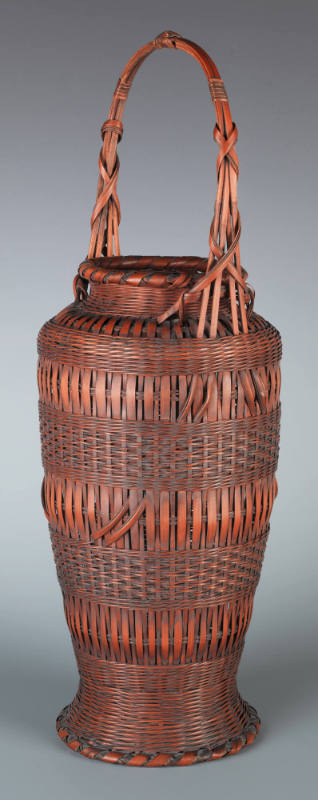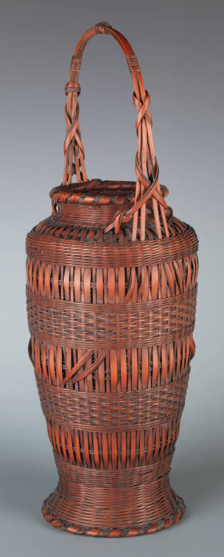Label TextJapanese basketry is an ancient craft form dating back some 2000 years. To a large extent, bamboo was an obvious material. Bamboo groves were (and still are) found in abundance across the country; the material itself is light, strong and fairly pliable, making it naturally suited to weaving. The earliest baskets were humble utilitarian vessels, used for storage and as portable containers. Bamboo baskets used for ikebana (flower arrangement) and the tea ceremony (chanoyu) became part of the aesthetics of chanoyu, elevating these humble wares to objects of artistic interest. In the early part of the 20th century, the mingei (folk art) movement led to a revival of interest in traditional Japanese crafts. Along with this, bamboo basketry came to be seen as more than “mere” craft; it was now a prestigious art form embodying a distinctly Japanese aesthetic identity. It is worth noting that geometric patterns on Japanese baskets are correspondingly found on textile, ceramic, and lacquerware designs, testament to a common aesthetic sensibility amongst the respective practitioners. Japanese bamboo baskets have been the subject of major exhibitions in recent years, such as the ones at the Museum of Fine Arts, Boston (2006) and at the San Francisco Asian Art Museum (2007), which owns the renowned Cotsen collection of more than 900 baskets.