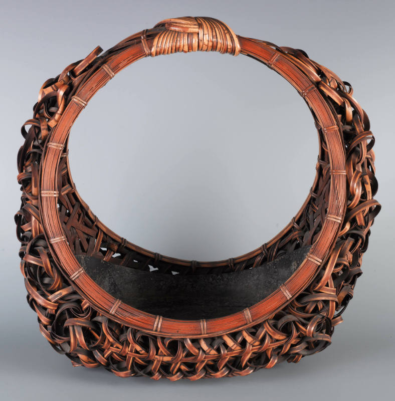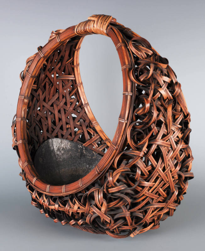 Japanese basketry is an ancient craft form dating back some 2000 years. To a large extent, bamboo was an obvious material. Bamboo groves were (and still are) found in abundance across the country; the material itself is light, strong and fairly pliable, making it naturally suited to weaving. The earliest baskets were humble utilitarian vessels, used for storage and as portable containers. Bamboo baskets used for ikebana (flower arrangement) and the tea ceremony (chanoyu) became part of the aesthetics of chanoyu, elevating these humble wares to objects of artistic interest. In the early part of the 20th century, the mingei (folk art) movement led to a revival of interest in traditional Japanese crafts. Along with this, bamboo basketry came to be seen as more than “mere” craft; it was now a prestigious art form embodying a distinctly Japanese aesthetic identity. It is worth noting that geometric patterns on Japanese baskets are correspondingly found on textile, ceramic, and lacquerware designs, testament to a common aesthetic sensibility amongst the respective practitioners. Japanese bamboo baskets have been the subject of major exhibitions in recent years, such as the ones at the Museum of Fine Arts, Boston (2006) and at the San Francisco Asian Art Museum (2007), which owns the renowned Cotsen collection of more than 900 baskets.
