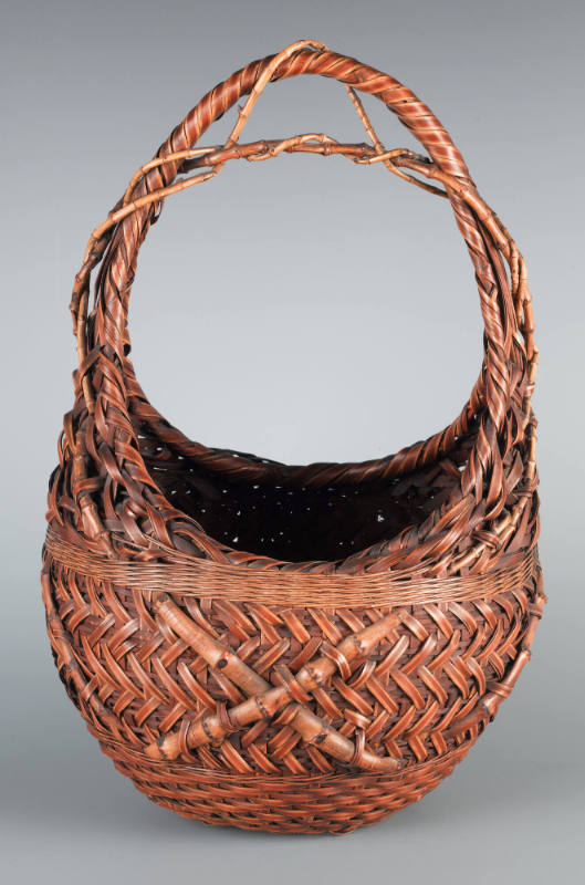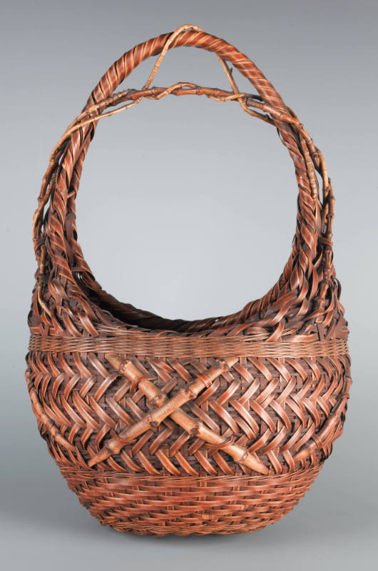 Label TextJapanese basketry is an ancient craft form dating back some 2000 years. To a large extent, bamboo was an obvious material. Bamboo groves were (and still are) found in abundance across the country; the material itself is light, strong and fairly pliable, making it naturally suited to weaving. The earliest baskets were humble utilitarian vessels, used for storage and as portable containers. Bamboo baskets used for ikebana (flower arrangement) and the tea ceremony (chanoyu) became part of the aesthetics of chanoyu, elevating these humble wares to objects of artistic interest. In the early part of the 20th century, the mingei (folk art) movement led to a revival of interest in traditional Japanese crafts. Along with this, bamboo basketry came to be seen as more than “mere” craft; it was now a prestigious art form embodying a distinctly Japanese aesthetic identity. It is worth noting that geometric patterns on Japanese baskets are correspondingly found on textile, ceramic, and lacquerware designs, testament to a common aesthetic sensibility amongst the respective practitioners. Japanese bamboo baskets have been the subject of major exhibitions in recent years, such as the ones at the Museum of Fine Arts, Boston (2006) and at the San Francisco Asian Art Museum (2007), which owns the renowned Cotsen collection of more than 900 baskets.