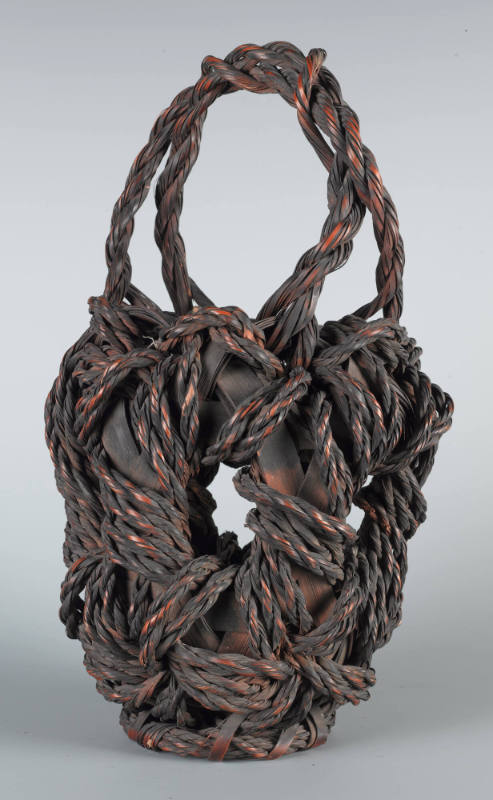 Japanese basketry is an ancient craft form dating back some 2000 years. To a large extent, bamboo was an obvious material. Bamboo groves were (and still are) found in abundance across the country; the material itself is light, strong and fairly pliable, making it naturally suited to weaving. The earliest baskets were humble utilitarian vessels, used for storage and as portable containers. Bamboo baskets used for ikebana (flower arrangement) and the tea ceremony (chanoyu) became part of the aesthetics of chanoyu, elevating these humble wares to objects of artistic interest. In the early part of the 20th century, the mingei (folk art) movement led to a revival of interest in traditional Japanese crafts. Along with this, bamboo basketry came to be seen as more than “mere” craft; it was now a prestigious art form embodying a distinctly Japanese aesthetic identity. It is worth noting that geometric patterns on Japanese baskets are correspondingly found on textile, ceramic, and lacquerware designs, testament to a common aesthetic sensibility amongst the respective practitioners. Japanese bamboo baskets have been the subject of major exhibitions in recent years, such as the ones at the Museum of Fine Arts, Boston (2006) and at the San Francisco Asian Art Museum (2007), which owns the renowned Cotsen collection of more than 900 baskets.