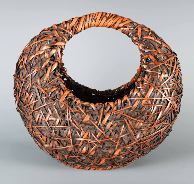 Label TextJapanese basketry is an ancient craft form dating back some 2000 years. To a large extent, bamboo was an obvious material. Bamboo groves were (and still are) found in abundance across the country; the material itself is light, strong and fairly pliable, making it naturally suited to weaving. The earliest baskets were humble utilitarian vessels, used for storage and as portable containers. Bamboo baskets used for ikebana (flower arrangement) and the tea ceremony (chanoyu) became part of the aesthetics of chanoyu, elevating these humble wares to objects of artistic interest. In the early part of the 20th century, the mingei (folk art) movement led to a revival of interest in traditional Japanese crafts. Along with this, bamboo basketry came to be seen as more than “mere” craft; it was now a prestigious art form embodying a distinctly Japanese aesthetic identity. It is worth noting that geometric patterns on Japanese baskets are correspondingly found on textile, ceramic, and lacquerware designs, testament to a common aesthetic sensibility amongst the respective practitioners. Japanese bamboo baskets have been the subject of major exhibitions in recent years, such as the ones at the Museum of Fine Arts, Boston (2006) and at the San Francisco Asian Art Museum (2007), which owns the renowned Cotsen collection of more than 900 baskets.