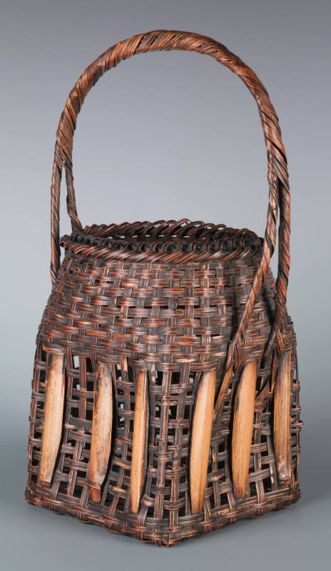 Japanese basketry is an ancient craft form dating back some 2000 years. To a large extent, bamboo was an obvious material. Bamboo groves were (and still are) found in abundance across the country; the material itself is light, strong and fairly pliable, making it naturally suited to weaving. The earliest baskets were humble utilitarian vessels, used for storage and as portable containers. Bamboo baskets used for ikebana (flower arrangement) and the tea ceremony (chanoyu) became part of the aesthetics of chanoyu, elevating these humble wares to objects of artistic interest. In the early part of the 20th century, the mingei (folk art) movement led to a revival of interest in traditional Japanese crafts. Along with this, bamboo basketry came to be seen as more than “mere” craft; it was now a prestigious art form embodying a distinctly Japanese aesthetic identity. It is worth noting that geometric patterns on Japanese baskets are correspondingly found on textile, ceramic, and lacquerware designs, testament to a common aesthetic sensibility amongst the respective practitioners. Japanese bamboo baskets have been the subject of major exhibitions in recent years, such as the ones at the Museum of Fine Arts, Boston (2006) and at the San Francisco Asian Art Museum (2007), which owns the renowned Cotsen collection of more than 900 baskets.