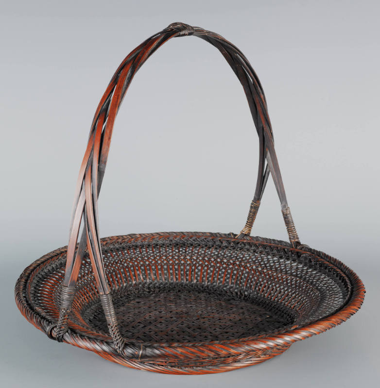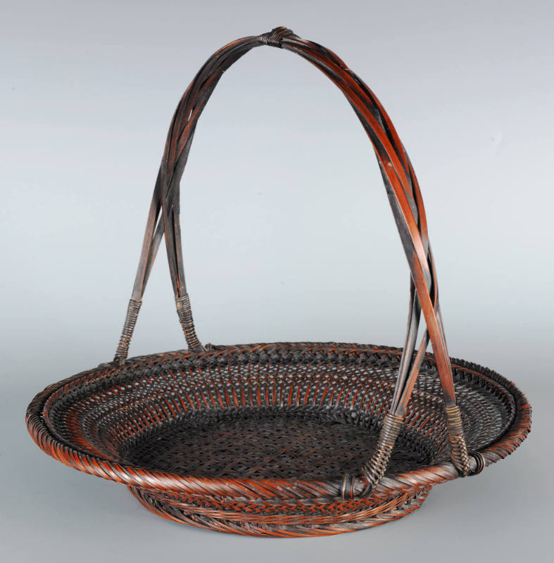 Label TextJapanese basketry is an ancient craft form dating back some 2000 years. To a large extent, bamboo was an obvious material. Bamboo groves were (and still are) found in abundance across the country; the material itself is light, strong and fairly pliable, making it naturally suited to weaving. The earliest baskets were humble utilitarian vessels, used for storage and as portable containers. Bamboo baskets used for ikebana (flower arrangement) and the tea ceremony (chanoyu) became part of the aesthetics of chanoyu, elevating these humble wares to objects of artistic interest. In the early part of the 20th century, the mingei (folk art) movement led to a revival of interest in traditional Japanese crafts. Along with this, bamboo basketry came to be seen as more than “mere” craft; it was now a prestigious art form embodying a distinctly Japanese aesthetic identity. It is worth noting that geometric patterns on Japanese baskets are correspondingly found on textile, ceramic, and lacquerware designs, testament to a common aesthetic sensibility amongst the respective practitioners. Japanese bamboo baskets have been the subject of major exhibitions in recent years, such as the ones at the Museum of Fine Arts, Boston (2006) and at the San Francisco Asian Art Museum (2007), which owns the renowned Cotsen collection of more than 900 baskets.