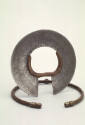 Herding camels and traveling long distances, the Turkana of northern Kenya make use of every ornament they wear. This wrist knife is razor-sharp and serves as jewelry and a weapon as well, used in fights and in wrestling contests. It is fabricated out of iron and then encased in leather to protect the edge from becoming dull and the wearer from injury. When collecting it in Kenya, Katherine White wrote, "I bought two razor bracelets, one with copper beads, the other ordinary but perfectly real."
