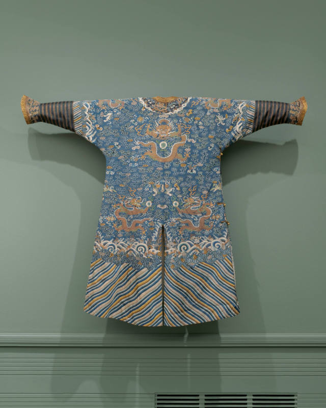 The blue color and five claws of the dragons on this jifu (semiformal court coat) indicate that it likely belonged to a Manchu prince or an official of Rank 1 or 2, at the top of the court hierarchy.