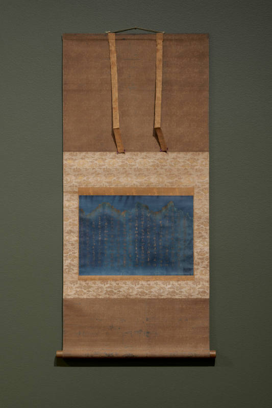 Label TextThis fragment is part of a set of sixty handscrolls of Flower Garland Sutra (Kegonkyo), which were donated to the Todaiji temple in Nara in 744. A fire in 1667 at the Nigatsudo Hall of the temple damaged the scrolls. Eleven years after the fire, the scrolls were repaired, but gradually they were dispersed to different collections and sections were remounted as hanging scrolls, such as this one. The damaged edges with burned marks convey the Buddhist idea of impermanence and make these fragments rather prized.