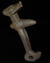Label TextA rare object collected by Captain James Cook on his voyage to the Pacific in 1778, this elegant sculpture originally was adorned with human hair and green bird feathers. The hole that serves as the eye of the bird would have held a cord to keep it attached to the wrist of the warrior. The simple yet forceful rendering of a wolf head on the striking end and a bird at the pommel are characteristic of pre-contact Nuu-chah-nulth art. Powerful supernatural wolves are often cited in their oral traditions.