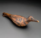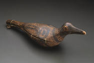 Label TextBird-shaped rattles are among the most elegant sculptures in the repertoire of central coastal cultures. Living on the Pacific flyway where a wide variety of birds have permanent and temporary residence, artists captured their essential shapes and qualities. This rattle—which may represent a type of gull—would possibly have been used during the important Wolf Ritual or other ceremonial proceedings. The surface is painted with lines and dashes to represent feather textures and the ovoids indicate wing joints.