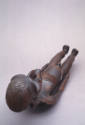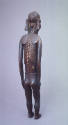 Label TextCadaverous wood figures from Rapa Nui communicate a visual distress signal that adds to the mystery of what happened on this unusual island. One mythic explanation cites a legendary hero carving the first of this type to commemorate discovery of two sleeping spirits with skeletal ribcages. Early observers recorded seeing small wooden figures being held up to the sky while others chanted and danced, particularly at feasts when the first fruits were offered. On the skull, an incised birdman may be a reminder of an annual quest to collect the first egg of a migrating bird.