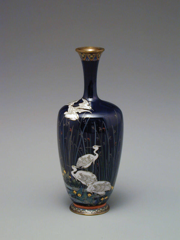 Label TextDuring the Meiji period, Japanese cloisonné craftsmen competed to enter their work at expositions in Europe and America, trying to extend their markets overseas. This movement turned cloisonné wear-multicolor enamels separated by silver wires and various other techniques they invented-into the most minute art form. Picturesque motifs in the Japanese style, such as this scene of herons in water, were especially popular, supported by fine ornamentation, as in this example of patterns encircling the top and bottom of the vase.