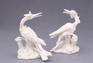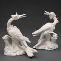 Label TextThese figures, recorded at the Bow factory as herons, are actually depictions of the mythical phoenix. Emblematically, these two birds were intertwined in many cultures. According to Herodotus and Plutarch, the phoenix, which originated in Ethiopia, was burned on an altar, then rose again from its own ashes. An ancient emblem of rebirth and immortality, the phoenix symbolized Christ’s resurrection in the early church and throughout the Middle Ages in Europe. This pair of lively porcelain phoenixes arose victorious from the fire of the Bow manufactory kilns. As the only known pair, they are extremely rare.