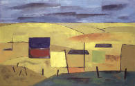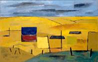 Label TextThis oil painting, more representational than the earlier works Ascent and Descent, depicts layer upon rolling layer of golden wheat fields. The work recalls an actual place in central Washington, a part of the state the artist frequently visited before the war. Squares of color, in blue and red, yellow, orange and green punctuate the picture plane, their abstract forms just barely readable as structures. The trapezoidal shapes, floating unsupported, are suggestive of barn roofs, though they could just as well be interesting shapes with no intrinsic significance. Lateral blue, grey and white brushstrokes create a richly layered sky, its intense color a striking contrast to the ochre hills.