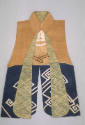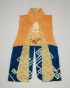 Label TextOriginally functional clothing, this type of samurai vest (called jimbaori in Japanese) became more of a personal adornment from the late 16th century on. Fine silk decorated with auspicious cloud patterns adorns the lapels and the collar. The white circle on the back is a crest for Watanabe, a famous samurai family of the 16th century.