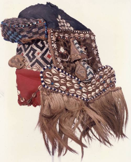 MediumBeads, cowrie shells, trade cloth, leopard skin, hair, wood, and raffia
