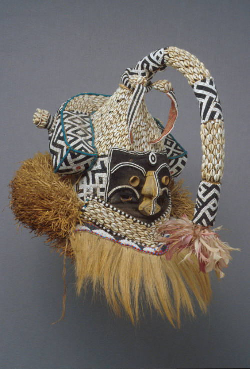 Label TextKuba leaders relied on masks to illustrate their alliance with the forces of nature. Here, an elephant's trunk is added to equate that creature's size, weight and stability with the ruler. Without eyeholes, the performer enacted a slow, dignified dance to personify Shyaam, the first human, bringer of civilization and founder of the Kuba dynastic line. It accompanied funeral ceremonies of great notables.