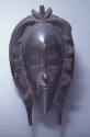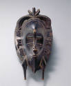 Label TextPerformers pay homage to female refinement in kpelie masquerades. Glistening black, crisply carved surfaces depict an idealized female face with features that include scarification marks and two protruding locks of hair. The character, which wore bright scarves and cloths and danced with swirling energy, was expected to honor the life and family of a deceased elder at a funeral.