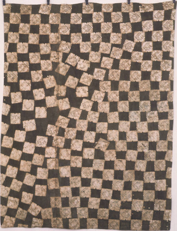 Repetition is taken for a ride on these cloths. Each pattern starts off with small designs placed side by side, duplicated over and over. Along the way, however, interruptions keep leading the designs astray. Cubes start to pile up on each other, dots collide and lines refuse to stay straight. This unpredictable visual pattern is considered by many to be a major element of the African aesthetic-a flair for accents that offer a percussive rhythm to visual and musical traditions. Here, a definite attraction to breaking routine is explored in cloths that were worn as skirts in West Africa.