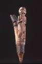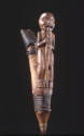 Label TextHalibut—giant flatfish that can weigh one hundred pounds or more—were traditionally caught from cedar canoes using special barbed hooks. Fishermen might use imagery that references the help of the shaman. This one represents a human figure with animal- like feet biting an octopus tenacle. The octopus appears frequently on shaman charms and was considered to be a supernaturally powerful being.