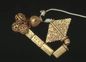 Label TextFifteenth century Europeans were impressed by the use of gold from the moment they landed in West Africa. By 1502, reports indicate that fifteen ships a year were reported to sail away with collections of gold ornaments. Over the next four centuries virtually all the ornaments were melted down; very few exceptions survived. As the gold trade diminished in the nineteenth century, the royal ornaments owned by enstooled leaders were not for sale. Any attempt to steal them was a breach of property rights and cause for immediate destooling. Goldsmiths stepped up production of gold ornaments in the late 1920s and again around 1935 when Asantehene Prempeh II was enstooled. It appears that the majority of the gold ornaments purchased by Katherine White came from this revival period.