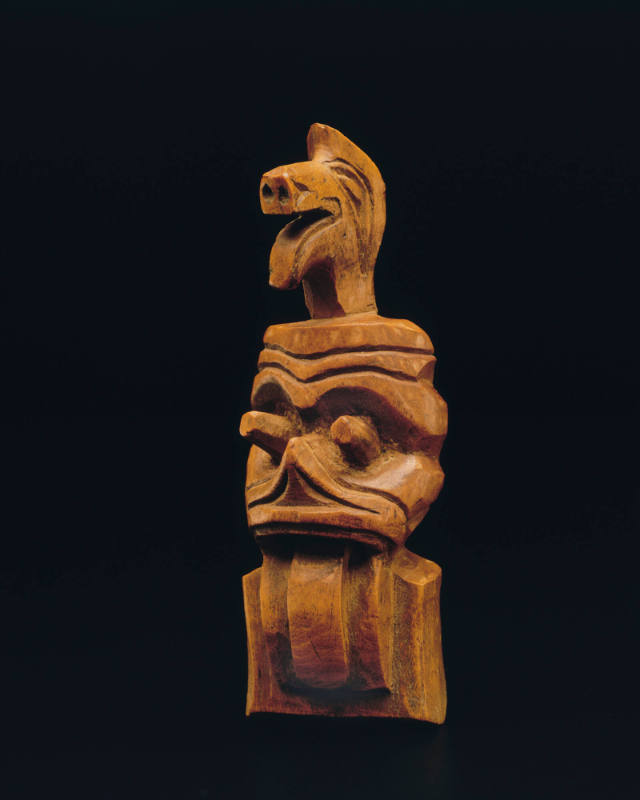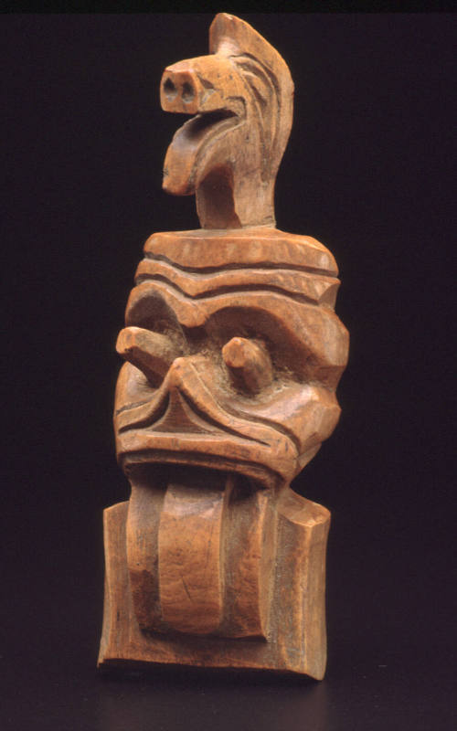 This unusual being is depicted on special masks used to bless and protect people in life crisis events, such as sickness and death. Only the person with the right to use the masks would know its deeper meanings. This small carving might have once been the finial of a rattle or the top of a staff.