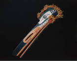 Label TextComparison of this mask with Martin’s later Huxwhukw, on this platform, shows how his powerful but simple carving changed over time to accommodate modern styles, by adding more embellishment and using shiny enamel paints. Fellow artist Willie Seaweed influenced such innovations. Here, Martin adds an unusual feature: a pair of hands on either side of the mask, perhaps in reference to the dancer’s grasp as he supports the heavy mask during performances.
