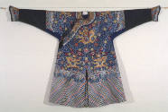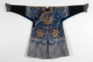 Label TextCourt attire was legislated by the Manchu rulers of China. Whether Han Chinese or Manchu, every person donned Manchu-style clothing where color, decoration, and quality of materials indicate status and rank. The blue silk and nine five-clawed dragons of this jifu (literally “auspicious dress”) indicate that it likely belonged to an aristocrat or high official. Repeated motifs of red bats and the character shou (longevity) offer the wearer wishes for good luck and a long life.