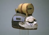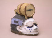 Label Text"A mockery of bad habits dominates this mask. A liquor barrel, dark glasses, fine-toothed comb, and cigarette over one ear are elements of a headdress that lampoons a certain elite. In the late nineteenth and early twentieth centuries, a group of Brazilian residents of African ancestry returned to Nigeria. They spoke Portuguese, were Catholic, and tended to segregate themselves. Following them were repatriates from Sierra Leone, more British oriented and Protestant. Both groups tended to part their hair as on this mask, drink Western liquor imported in barrels, and smoke. It is also possible that the mask simply refers to European colonialists who overindulged in drink, wore sunglasses, and smoked imported cigarettes. In assembling these clues, the mask jests as Gelede is best known to do: "In jesting, you approach someone in an intimate way-it is an aspect of friendship and it creates trust. It can promote well-being and purify a relationship." (Babatunde Lawal, 1999)