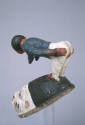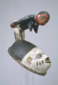 Label TextOn this Gelede mask a rather plain face supports a leering woman who bends at the waist, exposing her private parts. Babatunde Lawal observes "Some identify this figure as a brazen, callous woman-a prostitute, a woman of no virtue who is ready to have sexual relations with anybody." The mask wearer's movements would depict a promiscuous woman who walks provocatively and makes suggestive gestures to her admirers. "On the other hand, there are people who feel this pose is an attempt to draw attention to the female organ as a kind of gateway to life. People say that one cannot underrate the power of a woman, and that power can be traced to the private parts through which life must pass." (1999)