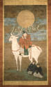 Label TextAccording to legends, the Kasuga Shrine was built in the 8th century after the Shinto deity Takemikazuchi no Mikoto arrived at Mount Mikasa near Nara, the capital at the time, from Kashima in northeast Japan. Takemikazuchi is portrayed here as a courtier mounted on a large white stag. Considered sacred as mounts for Shinto deities, deer are particularly revered in the Kasuga Shrine. Above Takemikazuchi and the stag, a large mirror hangs over a sakaki tree. The mirror forms part of the sacred regalia of Japan, along with a jewel and a sword.