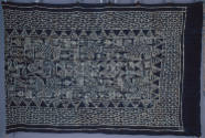 Blue cloths with white ideograms call people to attention in parts of Cameroon. They proclaim that it is time for law enforcement-someone is about to face the consequences of causing trouble or acting irresponsibly. Some are worn as skirts by leaders, while others are hung behind thrones or stools, like those seen in the center of this gallery.