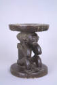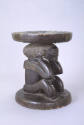 Label TextHuman form is rearranged to become furniture fit for a chief. Observe how this woman's hands, feet, shoulders and torso are conceived of as flat rectangles. In contrast, her arms and legs swell in prominent curves. Her pose of concentrated calm-elbows on knees and hands on head-is one that is associated with wise elders, or people deep in thought.