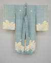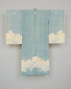 Label TextSymbolizing longevity, the traditional motifs of cranes in flight and pine trees are interpreted in an innovative manner on this child’s kimono. Set against a turquoise background, pine trees appear above and below the waves as silhouettes created by the playful use of color and negative space. Against the pine tree border, brightly-colored cranes soar above the swelling wave pattern. Delicate, calligraphic lines of ink emphasize the graceful bodies of the flying cranes.